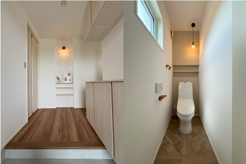 玄関正面の縦長ニッチやトイレ背面の横長ニッチ、玄関・トイレのじつはお揃いの照明💡